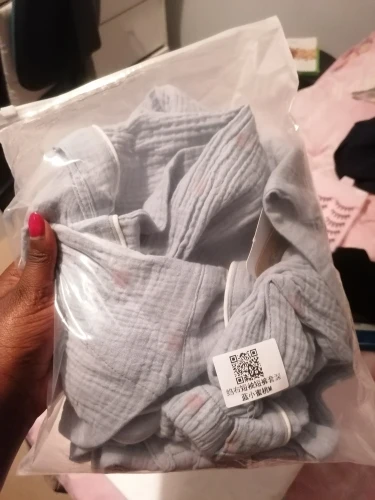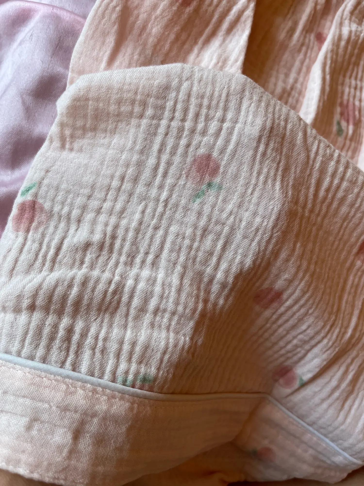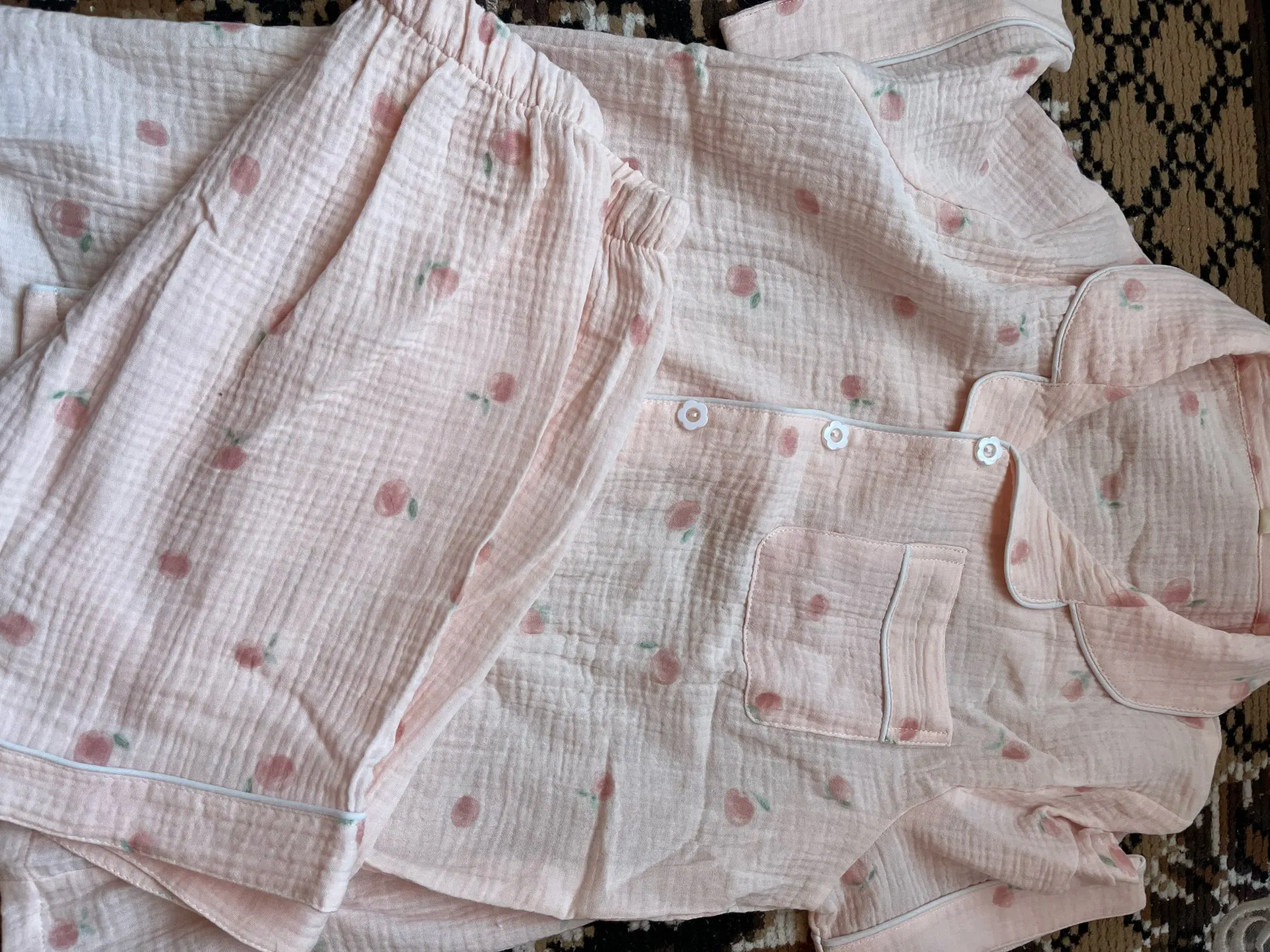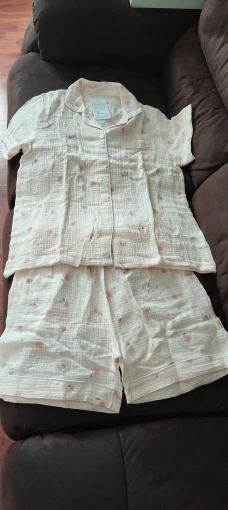 pleasant genuine muslin. the quality of the seams is good. The elastic on the shorts is quite tight, but the blouse is loose. in general, the size fits the parameters 95×75×95