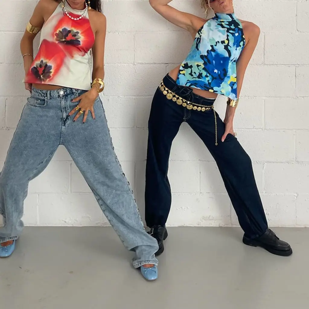 Combhasaki Women's Y2K Button Closure Halter Neck Crop Tops Sleeveless Backless Aesthetic Dots/Tie-dye Flower Print Summer Vests - AliExpress
