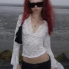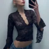 Home / Dulzura V-Neck Long Slit Flare Sleeves Lace T-Shirt See Through Sexy Crop Top Party Clubwear Autumn Winter Y2K – AliExpress