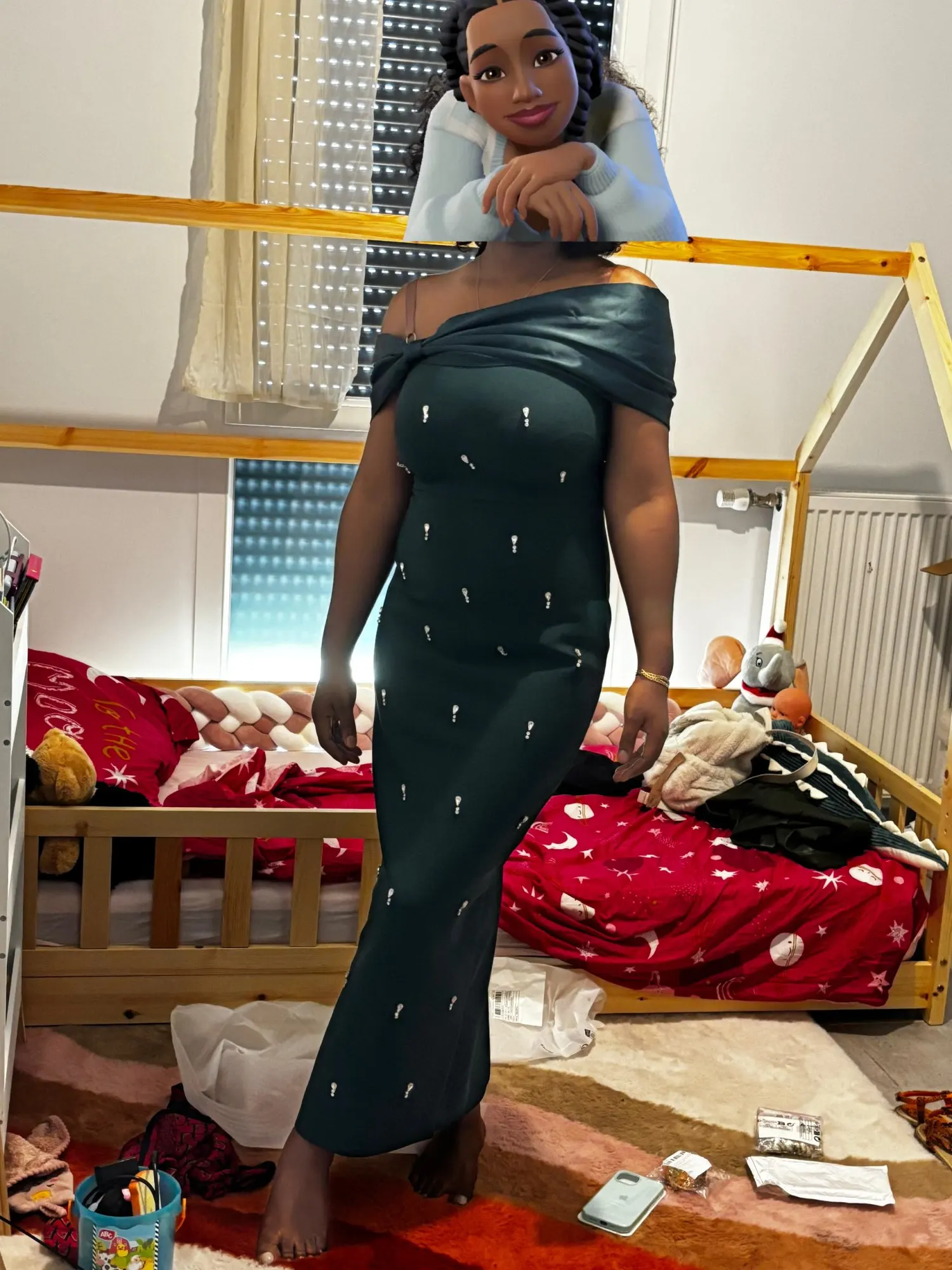 La robe est incroyable, le tissu est extensible mais lourd et luxueux, mais la taille est un peu grande.