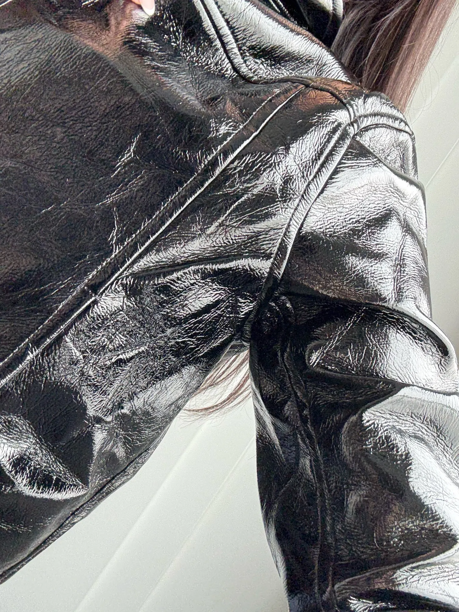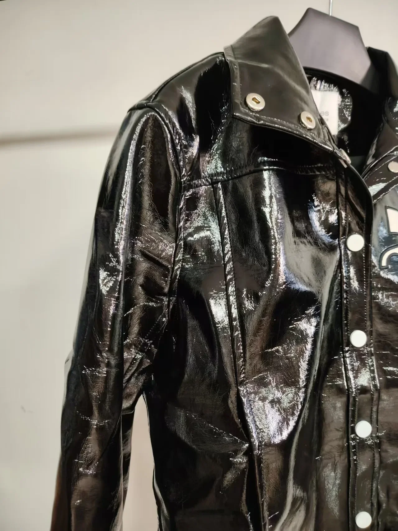 Very nice jacket, consistent with the photos. The synthetic leather has an elegant and shiny appearance, perfect for a chic or motorcycle style. Fits well, comfortable to wear and has neat finishes. I recommend!