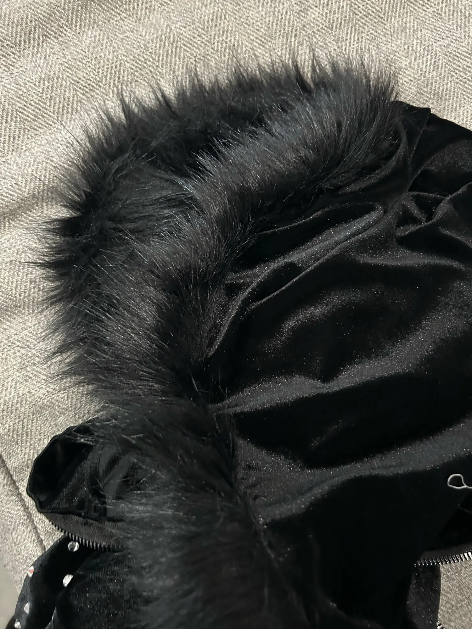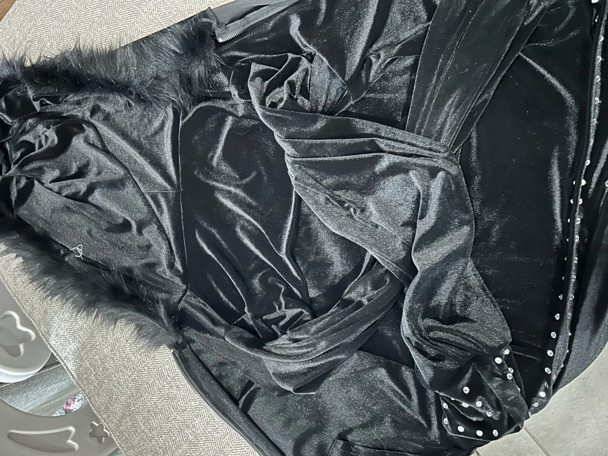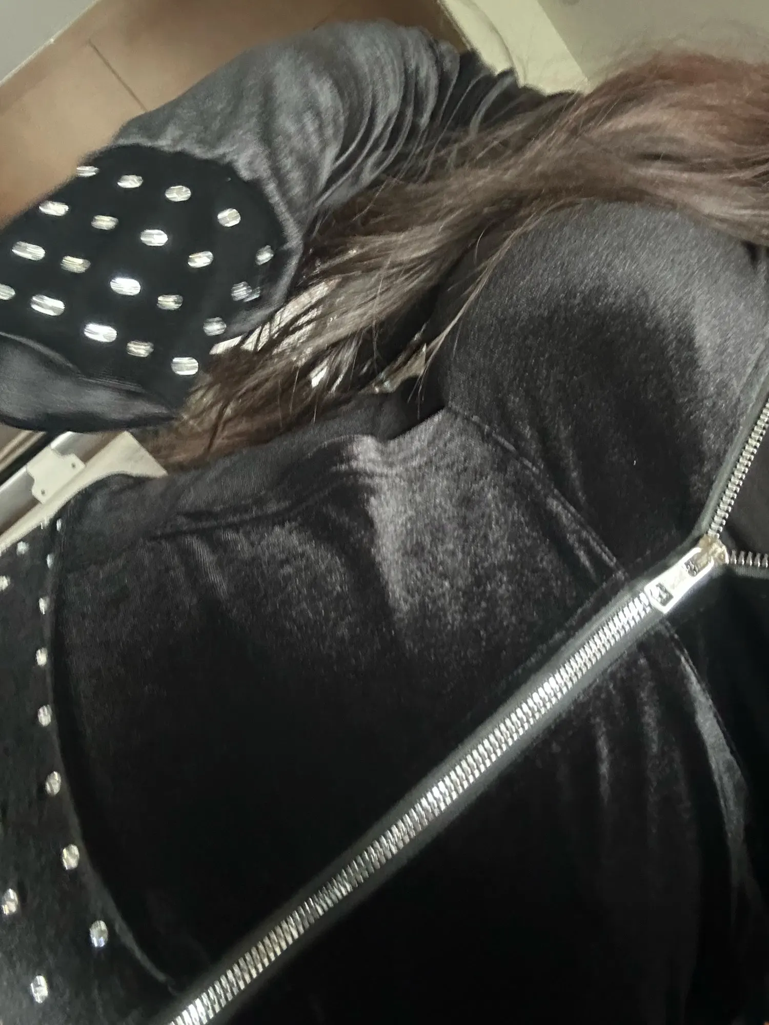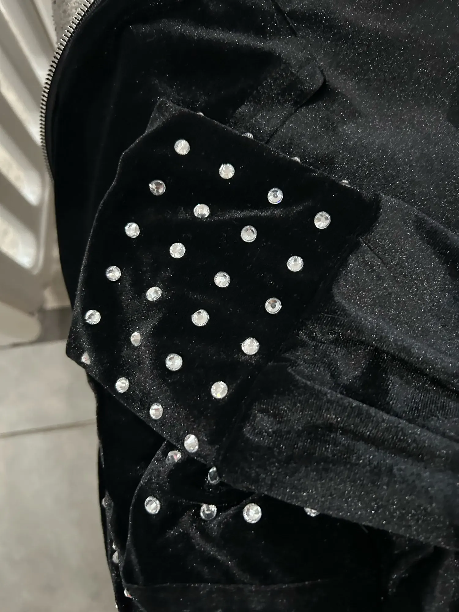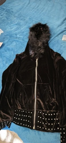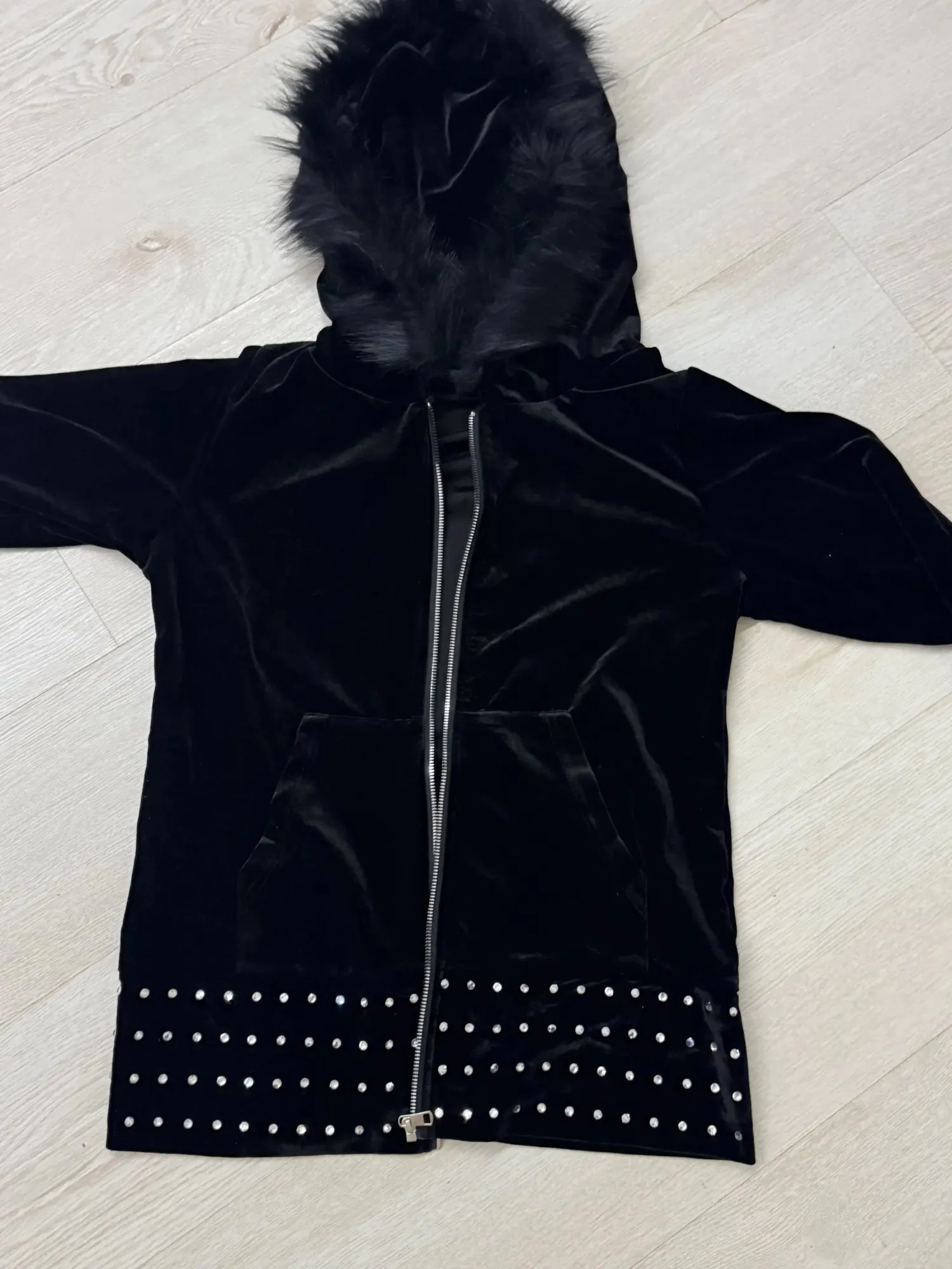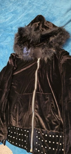 Cool velvet cardigan with a zipper, rhinestones on the sleeve cuffs and along the bottom of the cardigan.